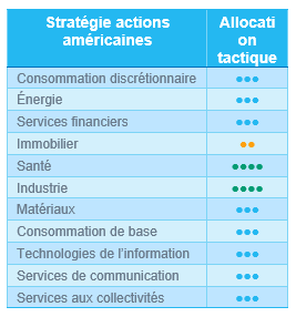 • Abaissement de la note des services financiers : le secteur a fortement progressé depuis le relèvement de sa note après les élections américaines, les investisseurs anticipant un assouplissement de la réglementation et une hausse des taux à long terme. Mais à ce stade, nous n’identifions aucun catalyseur – déréglementation ou hausse des taux – susceptible de prolonger sa surperformance. Nous avons donc décidé de prendre quelques bénéfices.
