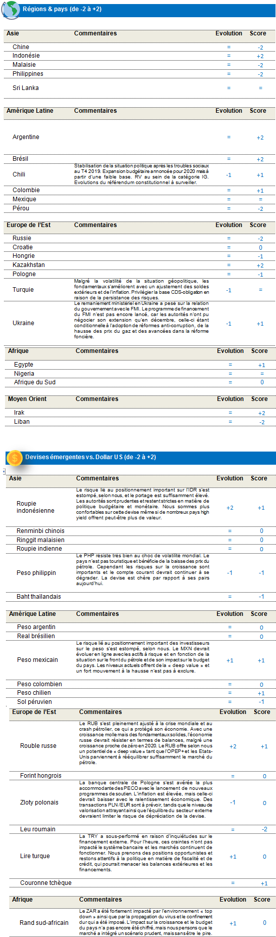 La dette émergente en devises fortes  a signé son plus mauvais mois depuis octobre 2008. En effet, toutes les conditions étaient réunies pour une baisse marquée, avec l’accélération de la pandémie de coronavirus et le lancement, par l’OPEP, d’une guerre des prix du pétrole (chute de 55 % des cours). Les actions internationales sont entrées en « bear market » suite aux fortes révisions à la baisse des chiffres de croissance, mettant un terme à la plus longue période d’expansion dans l’histoire des États-Unis.
