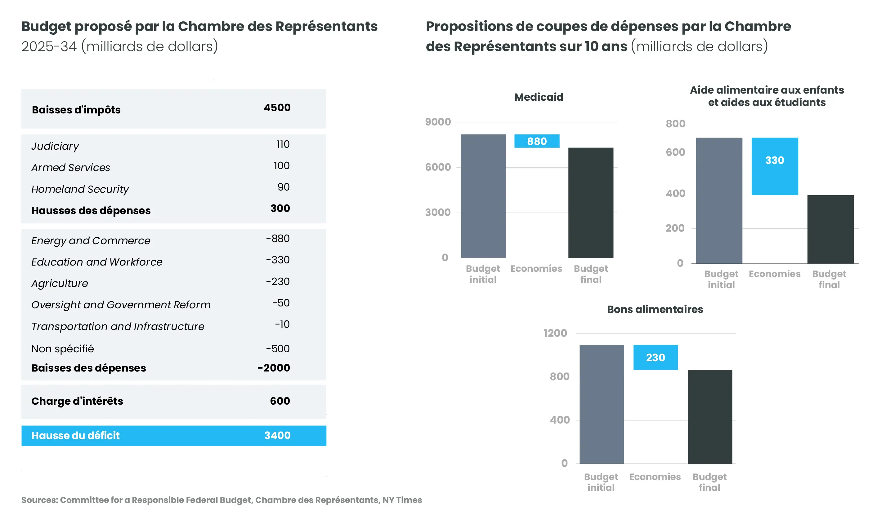 La Chambre des Représentants, et Donald Trump, prônent une stratégie différente et souhaitent le vote d’une seule grande loi budgétaire. La résolution proposée par la Chambre couvre une période de 9 ans et comprend 4 500 milliards de dollars de baisses d’impôts, 300 milliards de dépenses supplémentaires pour la sécurité aux frontières, la défense et la justice, et 2 000 milliards de coupes de dépenses largement centrées sur les programmes pour les plus défavorisés : sur la période 2025-2034 le déficit se creuserait de 3 400 milliards de dollars. Elle inclut aussi un relèvement du plafond de la dette de 4 000 milliards de dollars.