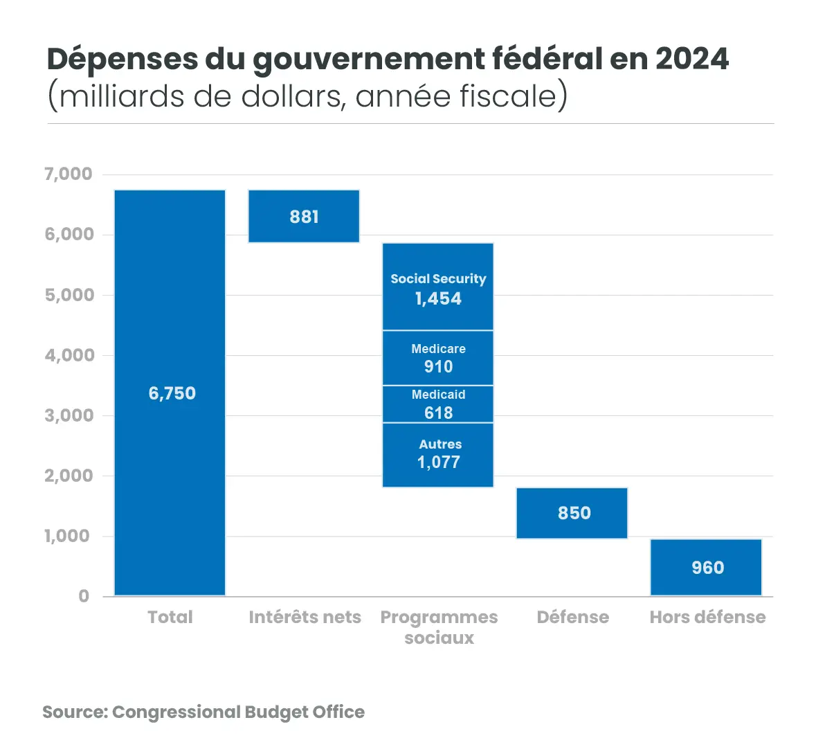 Au vu de la structure des dépenses fédérales, la promesse d’Elon Musk semble peu réaliste : le gouvernement doit s’acquitter des intérêts sur sa dette (près de 900 milliards de dollars) et le Président a annoncé qu’il ne toucherait ni aux retraites de Sécurité sociale (1 500 milliards de dollars) ni à Medicare (910 milliards de dollars). Couper dans la défense (850 milliards de dollars) serait également peu populaire auprès de l’électorat Républicain. Restent 960 milliards de dollars de dépenses discrétionnaires et 1 600 milliards de programmes sociaux (Medicaid, bons alimentaires, programme de nutrition pour les enfants…). Réduire de plus de moitié ces dépenses en un an relève toutefois de la gageure !