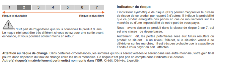 Concernant les fonds monétaires, votre attention est attirée sur le fait qu’un investissement dans un fonds diffère d’un investissement en dépôt et que le capital investi est susceptible de fluctuer. Le fonds ne bénéficie d’aucun soutien externe garantissant sa liquidité ou stabilisant sa valeur liquidative. L’investisseur supporte le risque de perte de capital.