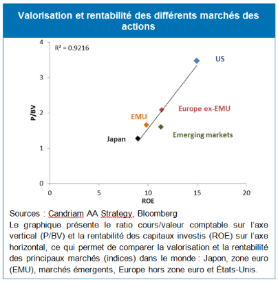 À l’heure actuelle, la valorisation des actions américaines reste attrayante par rapport aux obligations, mais elle l’est un peu moins par rapport aux niveaux historiques. La prime des actions américaines a été bien méritée mais sa marge de progression est maintenant réduite.