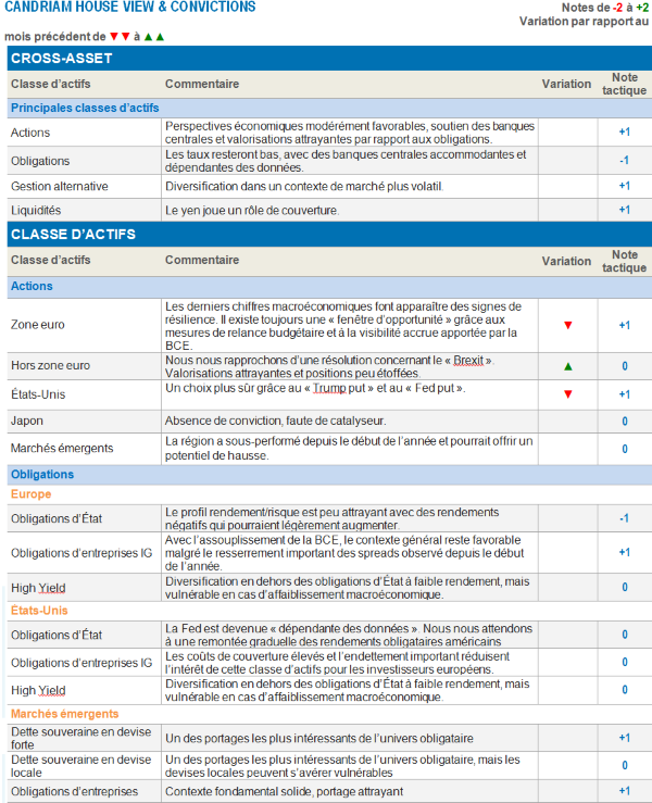 Lors des précédentes modifications de notre stratégie, nous avions neutralisé notre position vendeuse sur la livre sterling (GBP), car celle-ci avait cessé de se déprécier par rapport aux autres grandes devises. Notre avis négatif à long terme concernant les actions britanniques est lui-aussi devenu neutre. Nous avons pris une partie de nos bénéfices sur notre surpondération des actions américaines et de la zone euro. Pour l’avenir, nous avons désormais un positionnement neutre, hors instruments dérivés. Nous avons ajouté des options pour profiter d’une éventuelle poursuite du mouvement de hausse d’ici la fin de l’année. Nous avons également renforcé notre biais de valeur via les banques de la zone euro.