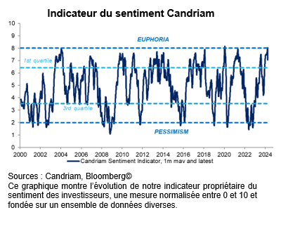 Notre indicateur composite du sentiment, fondé sur une batterie complète de facteurs de marché, de données techniques et d’enquêtes auprès des investisseurs, a atteint le niveau « euphorie » à la mi-mars, déclenchant un signal de vente à contre-courant sur les actions américaines. Après les bonnes performances enregistrées au cours des deux derniers trimestres, nous devrions désormais assister à une phase de consolidation.
