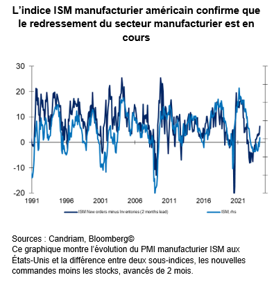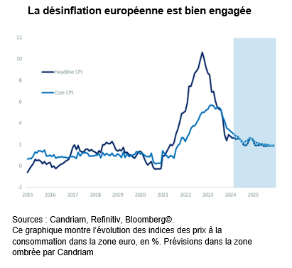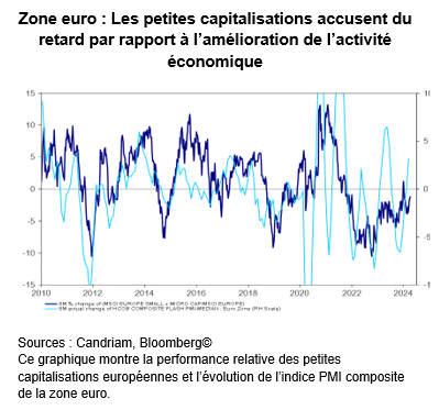 Au-delà d’une consolidation potentielle à court terme, notre point de vue plus favorable sur les actions européennes, pour lesquelles nous percevons une possibilité de reprise des flux et d’élargissement de la performance , repose sur un raisonnement fondamental simple : les baisses de taux de la BCE et l’amélioration de l’activité.
