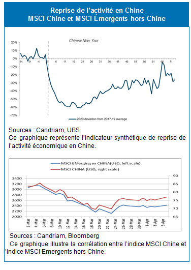 L’indice MSCI Chine n’a pas suivi la reprise de l’activité en Chine en mars. Comme les autres indices boursiers (S&P500, MSCI Émergents hors Chine), il a chuté jusqu’au 23 mars avant de rebondir.