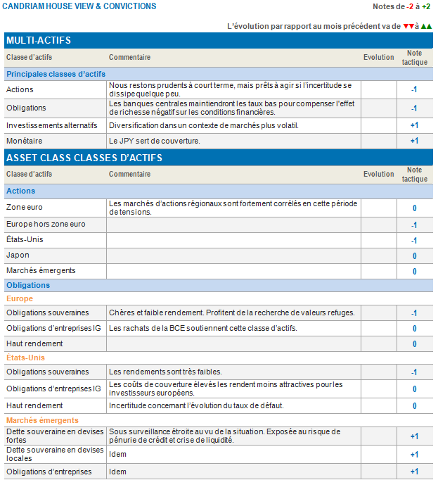 Nous sommes légèrement sous-pondérés en actions en Europe hors zone euro et aux États-Unis, et neutres pour les autres régions.