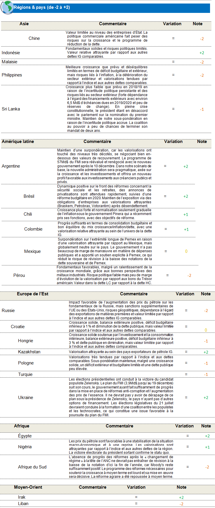 Nous restons sous-pondérés sur le Liban, la Russie et l’Arabie saoudite, estimant que les risques politiques ou de sanctions ne sont pas suffisamment rétribués par ces crédits. Nous avons une surpondération des obligations d’entreprises et quasi-souveraines du Brésil, du Mexique et de la Turquie, qui affichent des valorisations attrayantes, contre une sous-pondération de la dette souveraine. Nous conservons également une position tactique de 6 % sur l’indice de dérivés de crédit (CDX.EM) pour nous protéger d’une éventuelle recrudescence des risques liés au conflit commercial.