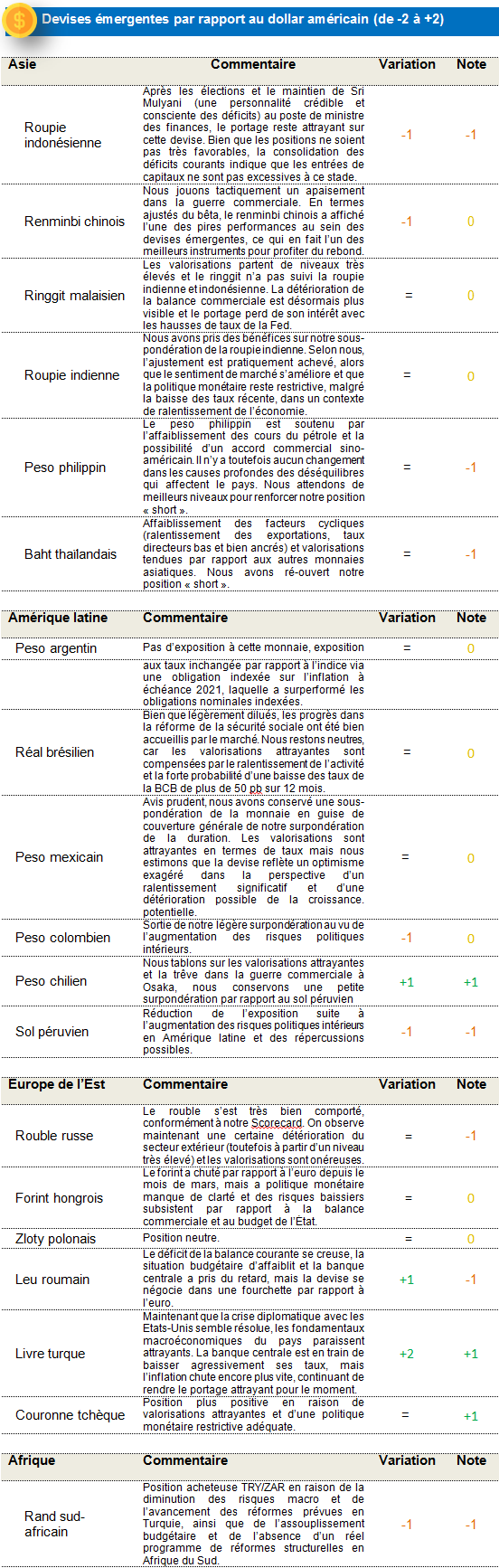 Notre scénario de référence pour 2019 prévoyait une croissance faible, mais en voie de stabilisation, sur les marchés développés et émergents, ce qui favorisait la duration par rapport aux devises émergentes. Parmi celles-ci, nous avons privilégié les devises des pays qui ont profité du ralentissement de la croissance pour comprimer la demande intérieure et améliorer leurs soldes extérieurs.