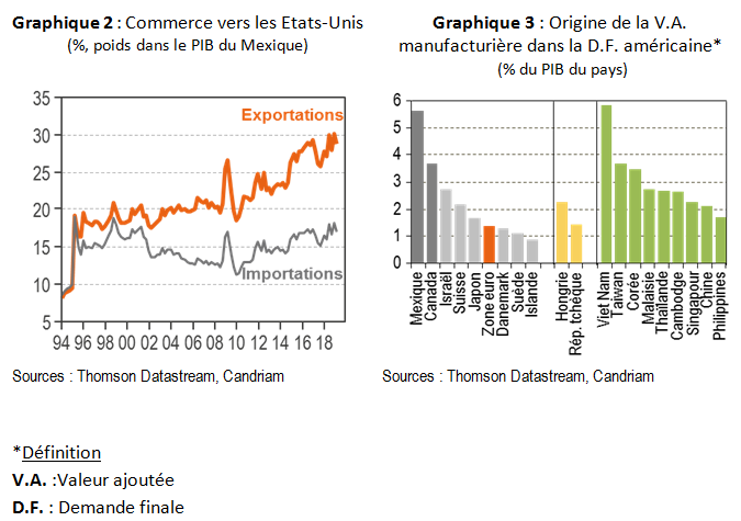 La menace, il y a quelques semaines, du Président américain de mettre des droits de douane sur tous les produits en provenance du Mexique (une taxe de 5 %, à partir du 10 juin, destinée à augmenter progressivement chaque mois jusqu’à 25 % le 1er octobre), a rappelé la vulnérabilité du Mexique. Au fil des ans, le pays s’est en effet rendu très dépendant de son voisin américain : près de 80 % de ses exportations sont à destination des seuls Etats-Unis et compte tenu de son taux d’ouverture, ces exportations représentent près de 30 % de son PIB (graphique 2). Le Mexique est, avec le Vietnam, de loin le pays le plus vulnérable à une hausse de droits de douane américains : la valeur ajoutée manufacturière qui satisfait la demande finale américaine représente plus de 5% de son PIB (graphique 3).