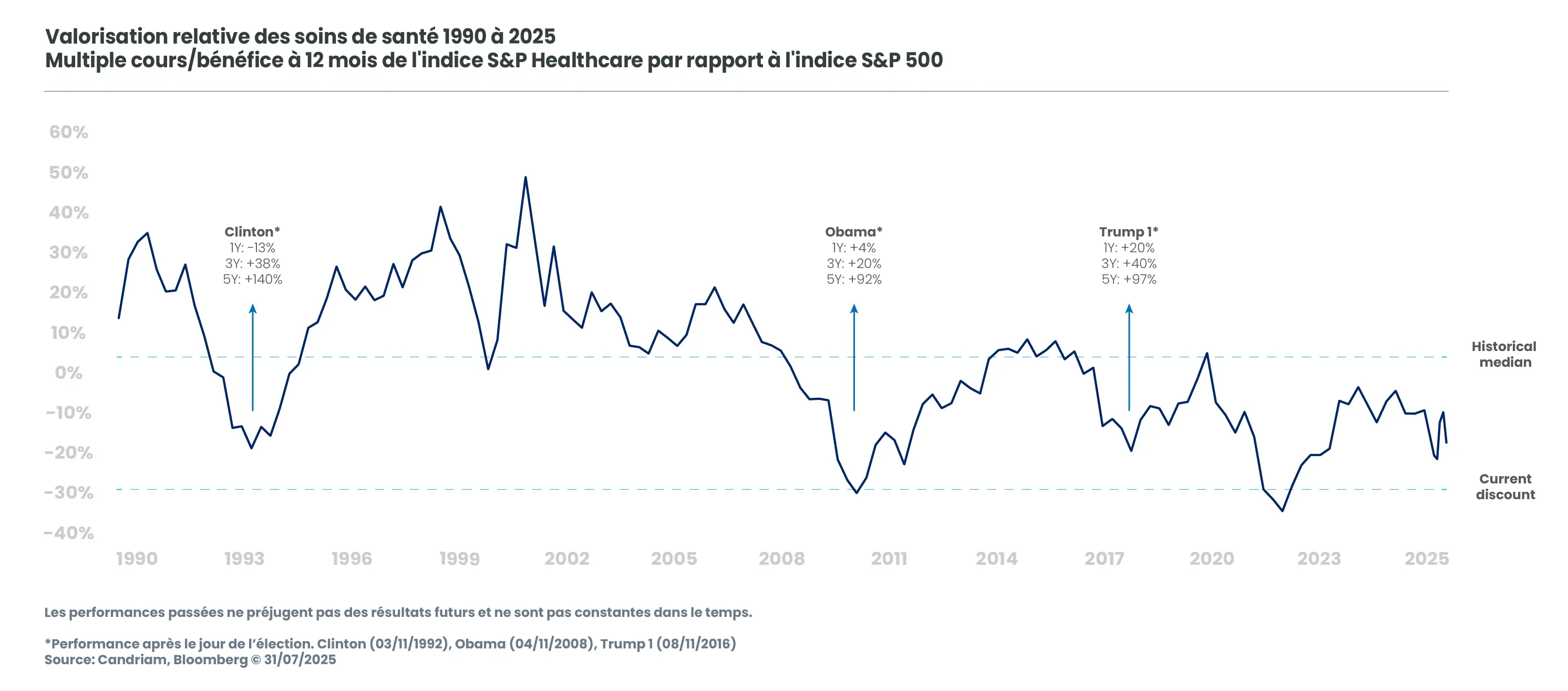 Aujourd'hui, le vieillissement des populations et l'augmentation des besoins en soins chroniques, portés par un cycle d'innovation technologique soutenue, élargissent les opportunités du secteur de la santé, alors même que les valorisations évoluent à des niveaux parmi les plus bas en relatif observés depuis plusieurs décennies. Cette combinaison d'une demande durable et d'une croissance sous-valorisée crée un point d'entrée rare pour les investisseurs à long terme.