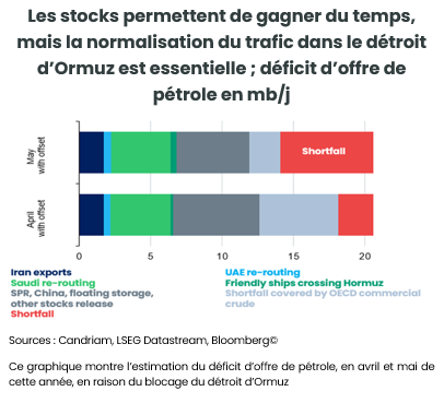 Les stocks de pétrole permettent de gagner du temps, mais ils ne peuvent pas compenser totalement une perturbation durable. Les données du mois d’avril montre que les flux réacheminés depuis l’Arabie saoudite et les Émirats arabes unis, associés aux réserves stratégiques et aux stocks commerciaux, peuvent encore couvrir une part importante des exportations iraniennes perdues, limitant ainsi le déficit immédiat. En mai, cependant, l’écart se creusera malgré les efforts d’atténuation : la capacité de réacheminement et le rôle des partenaires se stabiliseront, tandis que la dépendance à l’égard des stocks augmentera, laissant un déficit résiduel plus visible. La persistance d’un déficit, même avec des recours aux stocks coordonnés, souligne que les amortisseurs évoqués sont temporaires. En définitive, seule une normalisation du trafic dans le détroit d’Ormuz permettra de rétablir une offre mondiale de pétrole adéquate.