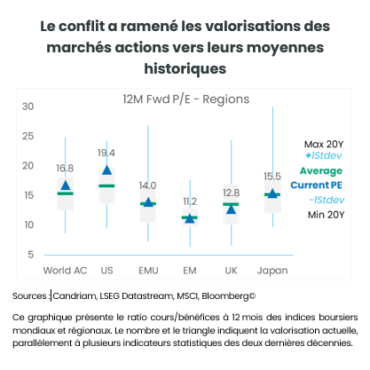 Cette situation est source de volatilité et d’instabilité des anticipations. Loin d’être ancrés, les marchés de l’énergie, les prévisions d’inflation et les hypothèses politiques sont ajustés en permanence. Dans ce contexte, le défi pour les investisseurs n’est pas de prévoir la prochaine évolution, mais d’évaluer la persistance du choc et l’ampleur de sa transmission dans le cadre macroéconomique. Cependant, on observe que les bourses se sont redressées après le choc initial, les fondamentaux des entreprises restant solides.
