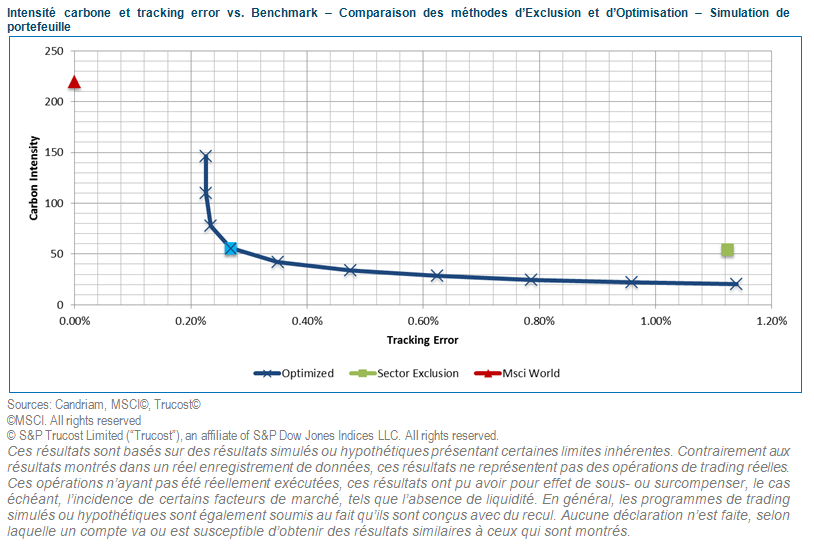 Nous avons comparé ces deux approches en termes d’intensité carbone et de tracking error, en utilisant l’indice MSCI© World comme indice de référence. Toutes les simulations ont été effectuées fin février 2019. Dans la première approche, nous avons exclu de l’univers d’investissement les trois secteurs les plus intenses en carbone et avons réalloué leurs poids de façon proportionnelle au reste du portefeuille. Dans la seconde approche, nous avons utilisé un modèle d’optimisation du portefeuille et un modèle de risque pour minimiser l’empreinte carbone, en limitant les pondérations sectorielles afin qu’elles soient conformes à celles de l’indice de référence MSCI©.