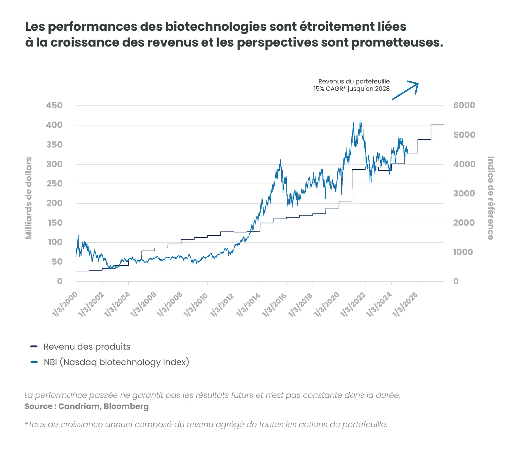 Le vieillissement démographique, les besoins médicaux non satisfaits, les progrès technologiques et une forte activité des opérations de fusions-acquisitions soutiennent le secteur sur le long terme. Aujourd’hui, la majorité des médicaments les plus vendus au monde sont issus des biotechnologies .