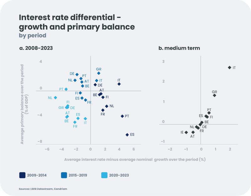 Avec un poids de la dette en hausse et des déficits primaires toujours élevés par rapport à 2019, les gouvernements abordent les années à venir dans une situation moins favorable. Alors que le coût moyen de l’endettement va continuer de monter, la baisse de l’inflation et la faiblesse des perspectives de croissance ne vont pas aider. A moyen terme, les gouvernements européens n’ont pas le choix : s’ils veulent éviter une dérive du poids de leur endettement, ils doivent ramener leur solde budgétaire primaire à l’équilibre (graphique b). L’équation est même sensiblement plus compliquée pour l’Italie : avec un poids de la dette élevé, des taux d’intérêt eux aussi élevés et une croissance assez faible, elle va devoir dégager durablement des excédents primaires.