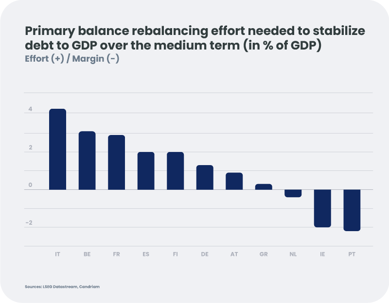 Au final, pour trois pays au moins, les efforts à fournir sur les prochaines années sont loin d’être négligeables : la France, la Belgique et l’Italie doivent réduire leur déficit primaire de respectivement 3, 3,5 et 4 points de PIB. Rappelons toutefois que depuis la création de la zone euro en 1999, l’Italie n’a eu de déficit primaire que pendant cinq années (en 2009 et depuis la pandémie), quand la France, elle, n’a eu des excédents primaires – parfois modestes ! – que pendant cinq années…