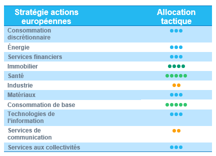 Nous maintenons en outre notre note positive (+2) sur le secteur de la santé. En Europe, le secteur offre un profil de rendement/risque attrayant grâce à des valorisations raisonnables, une forte visibilité des flux de trésorerie et de solides projections de bénéfices.