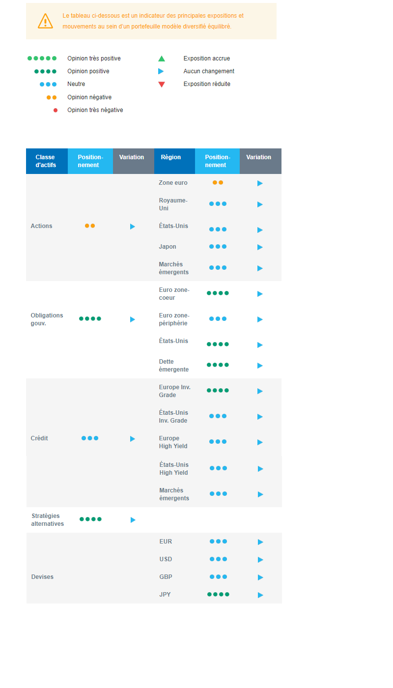 Nous maintenons une légère sous-pondération des actions, relativement moins attractives, et une position longue sur la duration obligataire. Sur le front des actions, nous sous-pondérons la zone euro et sommes neutres vis-à-vis du Japon, des marchés émergents et des États-Unis. Au sein de la poche obligataire, nous mettons l’accent sur le crédit générateur de portage (dette investment grade et émergente). En termes de secteurs, compte tenu des anticipations de recul des rendements obligataires et de la résistance avérée des bénéfices, nous sommes optimistes à l'égard du secteur technologique américain. Par ailleurs, nous conservons notre préférence défensive pour la santé et la consommation courante et intégrons le fait que le cycle de resserrement monétaire touche à sa fin.