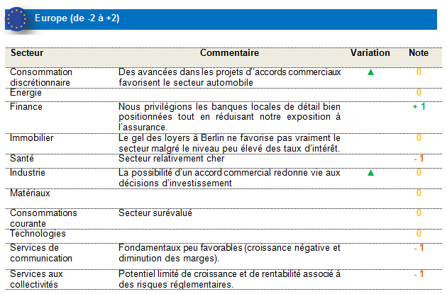 Nous continuons de positionner nos portefeuilles sur des titres de valeur, qui sont plutôt bon marché avec un potentiel de hausse à court terme. Nous avons ainsi ramené notre « sous-pondération » de l’industrie en position « neutre », car l’espoir d’un accord commercial entre les États-Unis et la Chine pourrait favoriser les dépenses d’investissement. Nous avons également décidé de porter notre exposition à l’automobile en « surpondération » en raison de l’amélioration récente des perspectives d’accord commercial et des bons résultats affichés pour le 3e trimestre alors que le secteur est plutôt bon marché et peu détenu par les investisseurs internationaux. Nous sommes par conséquent passés en position « neutre » sur la consommation discrétionnaire tout en conservant notre « sous-pondération » du secteur du luxe en raison de valorisations élevées.