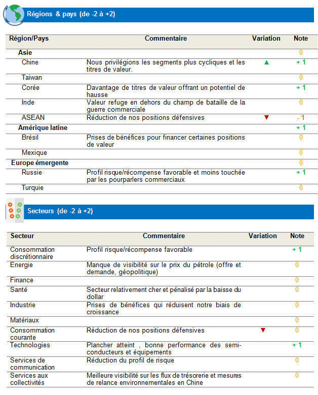 Nous avons conservé nos positions neutres sur le Brésil et Taiwan, avec un léger biais positif sur les titres de valeur. Nous avons accru notre exposition à la Chine pour passer en « surpondération » tout en réduisant nos positions sur l’ASEAN qui est passée en « sous-pondération », car nous sommes plus enclins à nous positionner sur des titres cycliques ou de valeur plutôt que sur des segments défensifs. Nous avons donc maintenu notre surpondération de la technologie (principalement sur les équipements et les semi-conducteurs) et réduit notre exposition aux secteurs défensifs en sous-pondérant la consommation courante.
