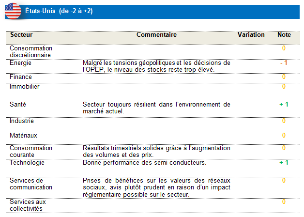 Nous conservons notre position négative sur l’énergie en raison de révisions de résultats peu favorables, tout en restant positifs sur la technologie (équipements et semi-conducteurs principalement). Nous conservons une surpondération de la santé, car le secteur continue d’afficher d’excellents résultats. Nous continuons d’accroître notre exposition aux titres de valeur, qui sont plutôt bon marché, tout en conservant une position positive sur les actions américaines.