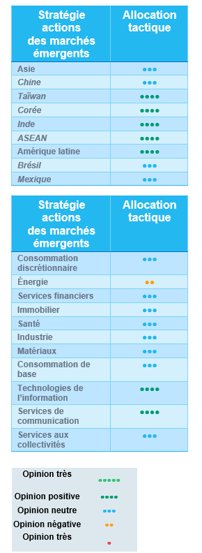 Aucune modification de nos opinions régionales. Nous restons neutres sur la Chine et suivons l'évolution des mesures de relance et l'impact des élections.