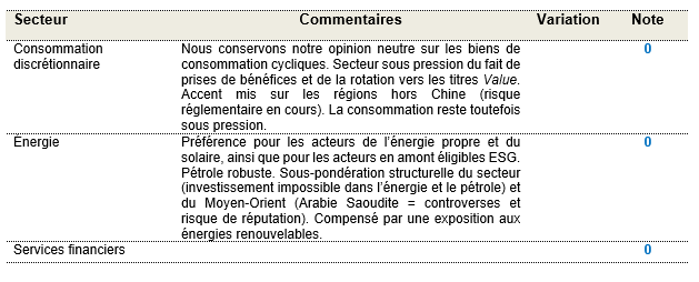 Nous sommes désormais neutres sur les banques (de +1 à 0) et les financières (de +1 à 0).