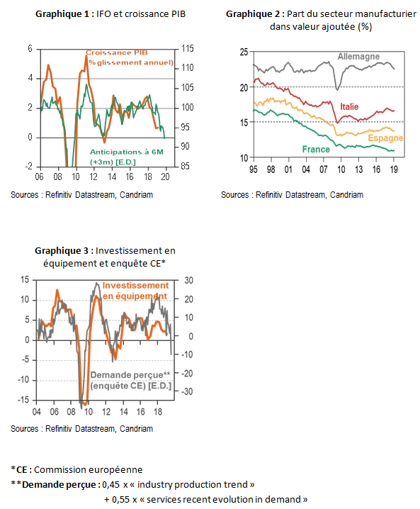 Alors que plusieurs facteurs exceptionnels avaient pesé sur le secteur manufacturier sur la seconde partie de l’année 2018, beaucoup espéraient une ré-accélération de l’activité au printemps 2019. Il n’en a rien été (graphique 1). Le ralentissement du commerce mondial, de la Chine en particulier, et plus récemment le contrecoup des achats importants par le Royaume-Uni en prévision de la sortie de l’Union européenne (initialement fixée au 29 mars dernier) continuent en effet de freiner les exportations allemandes et, partant, l’industrie. Le PMI manufacturier est ainsi tombé en un an de 56,9 à 43,2. De plus, avec la faiblesse des pluies et la vague récente de chaleur, le trafic sur le Rhin est à nouveau à risque, ce qui pourrait affecter le secteur de la chimie au troisième trimestre. Compte tenu du poids important du secteur manufacturier dans l’économie allemande (graphique 2), l’aggravation de la contraction industrielle ne peut que freiner plus encore la croissance. Le risque de voir l’investissement productif s’arrêter devient ainsi réel (les derniers indicateurs montrent d’ailleurs une chute inquiétante de la demande perçue par les entreprises – graphique 3). Quant aux ménages allemands, malgré un taux de chômage toujours très bas, leur confiance est en train de s’éroder.
