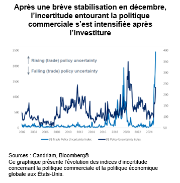 Le choc d’incertitude entourant la politique commerciale sous le deuxième mandat de Donald Trump est inédit et dépasse celui observé lors de son premier mandat. Cette incertitude affecte les décisions d’investissement, la gestion des stocks et les prévisions économiques plus générales, entraînant une révision à la baisse des anticipations concernant la croissance américaine et alimentant ainsi une boucle de rétroaction négative.