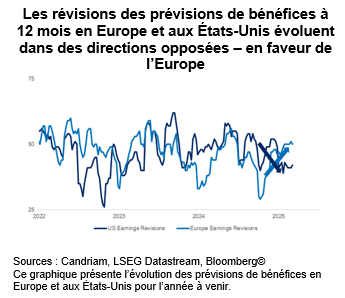 - Redressement des bénéfices en Europe : en conséquence, les prévisions de bénéfices des entreprises européennes sont révisées à la hausse, contrairement aux États-Unis où elles sont révisées à la baisse. Cette force fondamentale soutient la surperformance des actions européennes depuis le début de l’année.