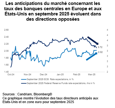 Les facteurs qui sous-tendent la révision à la baisse des prévisions de croissance économique et des bénéfices se manifestent également sur les marchés de taux : les anticipations concernant la politique monétaire sont tiraillées entre les craintes entourant la croissance américaine et les espoirs que suscitent les dépenses budgétaires en Europe. Concernant l’Allemagne, les émissions supplémentaires pour financer les dépenses de défense et d’infrastructures ne devraient pas mettre en cause le maintien de la note AAA du pays.