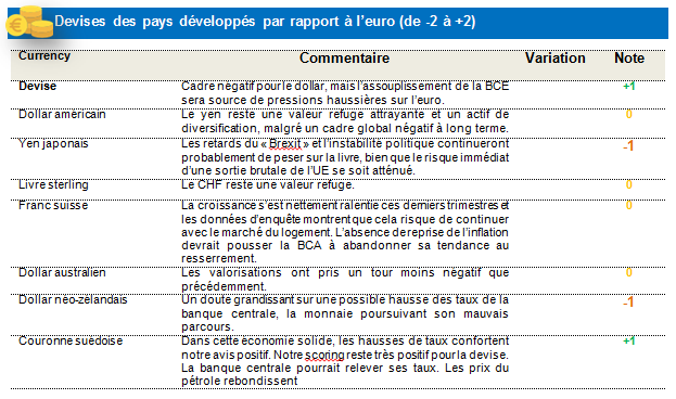 Notre scoring reste positif sur la couronne norvégienne et nous avons donc conservé notre position acheteuse sur cette monnaie, qui bénéficie également d’une économie relativement solide, où le cycle économique, bien qu’en territoire baissier, a peu de chances de tomber en récession et où les surprises économiques devraient être positives. De plus, si la banque centrale continuait de relever ses taux, cela pourrait soutenir encore plus la devise. En revanche, la couronne suédoise continue de subir des pertes importantes, les médiocres données macroéconomiques ayant semé le doute sur une probable hausse des taux. Cette monnaie est également vulnérable aux guerres commerciales, les exportations représentant une partie importante de la dynamique du pays.