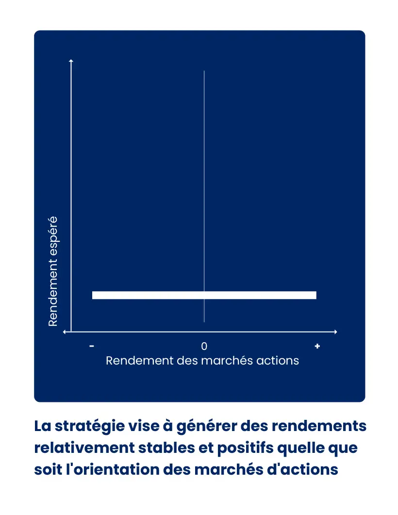 Les stratégies market neutral consistent à prendre des positions à l’achat et à la vente sur des actifs, dans le but d'exploiter les inefficiences du marché en termes de prix ou de valeur relative. Elles visent à atteindre une faible exposition nette au marché des actions, et un niveau de volatilité faible à modéré. Nous avons identifié en particulier deux segments de marché où nous nous efforçons d'extraire de la valeur tout en offrant des rendements réguliers :