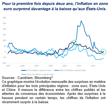 En termes de fondamentaux, l'Europe reste à la traîne, les indicateurs économiques et les chiffres de l’inflation s’avérant inférieurs aux attentes alors que les mauvaises surprises se succèdent. Au début du quatrième trimestre, les surprises en matière de croissance restent nettement moins bonnes qu'aux États-Unis et en Chine. Cependant, les surprises sur le front de l'inflation ont changé de cap cette année et sont désormais inférieures au niveau enregistré aux États-Unis.