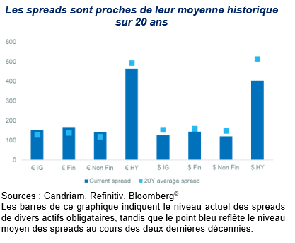 Alors que les rendements souverains ont atteint des sommets de plusieurs décennies en raison du durcissement monétaire, les spreads de la plupart des actifs obligataires sont proches de leur moyenne à long terme. Par conséquent, le rendement d’un portefeuille équilibré offre à nouveau une certaine protection contre la volatilité à court terme.