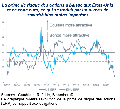 Le couple rendement/risque ne semble guère attrayant, la prime de risque des actions étant actuellement insuffisante pour inciter les investisseurs à renforcer leurs positions.