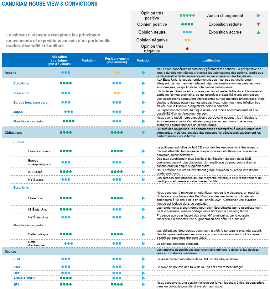 Par conséquent, nous n’hésiterons pas à allonger la duration de notre allocation d’actifs si nous pensons que le pic des taux directeurs des principales banques centrales a été dépassé. Sur le front du crédit, nous sommes positifs sur le crédit Investment Grade, une classe d'actifs résiliente dans un cycle de ralentissement et présentant l'un des meilleurs ratios portage-volatilité. En revanche, compte tenu des risques baissiers identifiés dans nos scénarios, la prime de risque des actions n'est pas suffisamment attrayante pour encourager les investisseurs à renforcer leurs positions.
