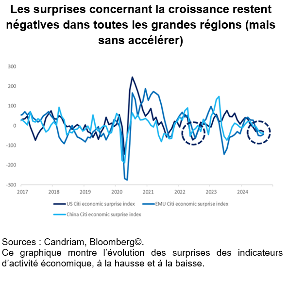 Le ralentissement synchronisé de l’activité mondiale se poursuit, mais le rythme des mauvaises surprises semble s’être stabilisé dans toutes les grandes régions. Actuellement, les marchés anticipent des baisses de taux agressives au cours de l’année à venir, alors que la Fed et la BCE assouplissent leur politique en septembre et que le contexte demeure déflationniste en Chine.