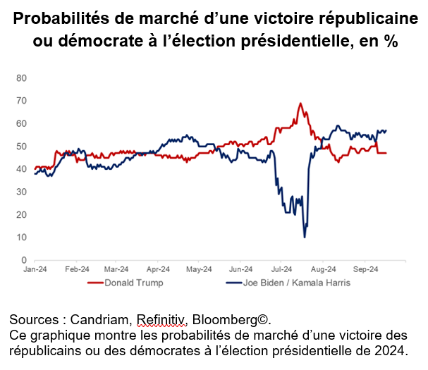 Les probabilités de marché montrent actuellement une légère avance de la candidate démocrate dans la course à la Maison Blanche, mais un Sénat républicain, ce qui aboutirait à un gouvernement divisé. En l’état actuel des choses, le fait d’avoir un gouvernement divisé devrait avoir le moins d’impact sur les marchés, car les politiques commerciales, budgétaires et d’immigration de Donald Trump/Kamala Harris devraient être moins radicales pour être adoptées par le Congrès.