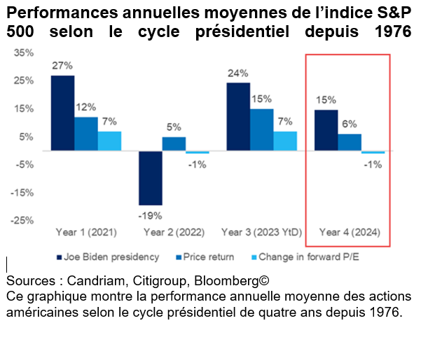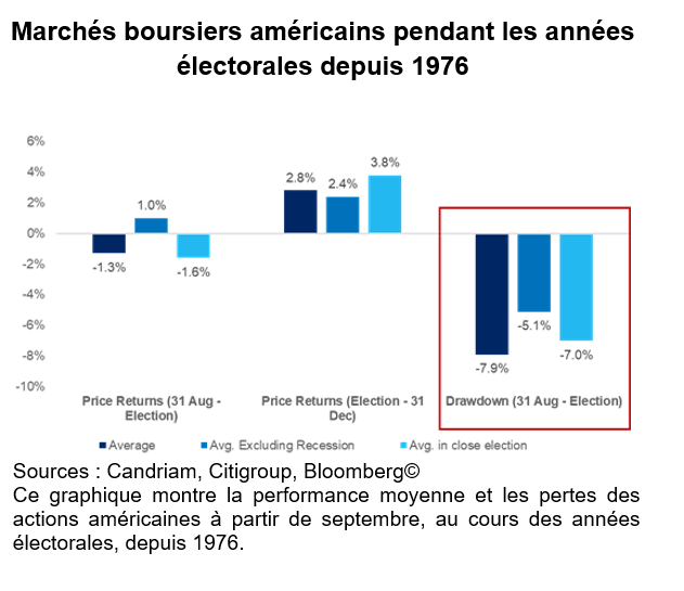 Nous observons que les performances depuis le début de l’année des marchés boursiers américains à la mi-septembre (environ +15 %) sont nettement supérieures à la moyenne de la quatrième année d’un cycle présidentiel (environ +6 %) observée au cours des cinq dernières décennies, ce qui pourrait impliquer une baisse à venir. Cette hypothèse est compatible avec le comportement moyen des marchés boursiers américains lors des années électorales, de la fin août au jour de l’élection, où la baisse moyenne s’élève à près de 8 %. La bonne nouvelle est que les investisseurs bénéficient d’une reprise moyenne en fin d’année de près de 3 %, une fois l’élection passée.
