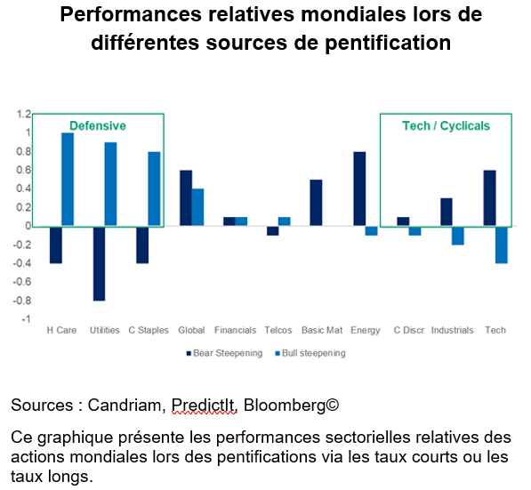 La pentification à venir de la courbe des taux – via les taux courts ou les taux longs – aura également des conséquences majeures pour les investisseurs en actions : une pentification de la courbe avec des taux courts qui baissent plus que les taux longs est plus favorable aux secteurs défensifs comme la santé, les services aux collectivités et les biens de consommation de base. Une pentification de la courbe avec une hausse plus marquée des taux longs que des taux courts est plus favorable aux secteurs technologiques et cycliques comme les matériaux de base, l’énergie et les valeurs industrielles.
