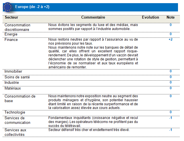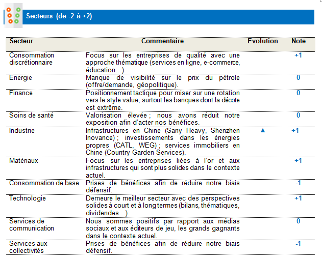 Dans le secteur de la consommation discrétionnaire, nous avons relevé notre note sur l’industrie automobile au vu dela valorisation attractive et des signaux de reprise. Nous maintenons aussi notre surpondération sur les services aux consommateurs.