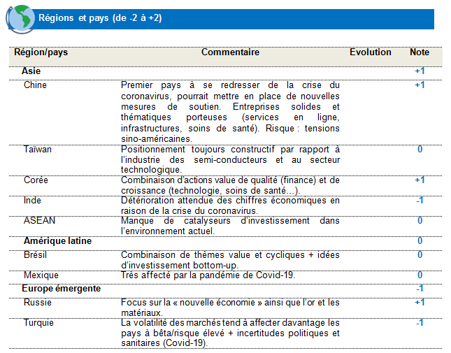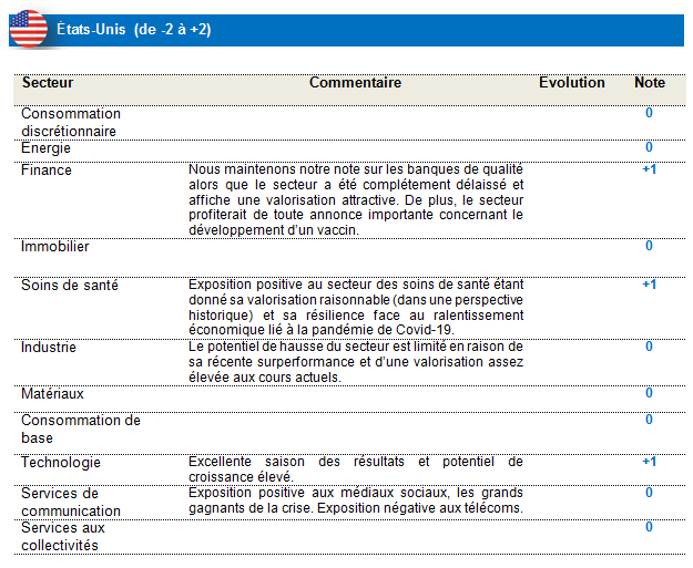 Nous restons surpondérés sur le secteur technologique malgré sa valorisation relativement élevée. Les entreprises du secteur ont publié d’excellents résultats et annoncé des perspectives de croissance favorables. Nous maintenons notre note à neutre pour l’industrie, le potentiel de hausse du secteur étant limité en raison de sa récente surperformance et d’une valorisation assez élevée aux cours actuels. Nous confirmons aussi notre surpondération sur le secteur des médias et du divertissement, les réseaux sociaux étant les grands gagnants de la situation actuelle. Enfin, nous avons conservé notre exposition positive au secteur des soins de santé en raison de sa valorisation raisonnable (tout particulièrement dans une perspective historique) et de sa résilience face au ralentissement économique lié à la pandémie de Covid-19. Par ailleurs, bien que nous suivions de près la campagne électorale aux États-Unis, la situation reste actuellement trop confuse que pour entreprendre une modification des portefeuilles.