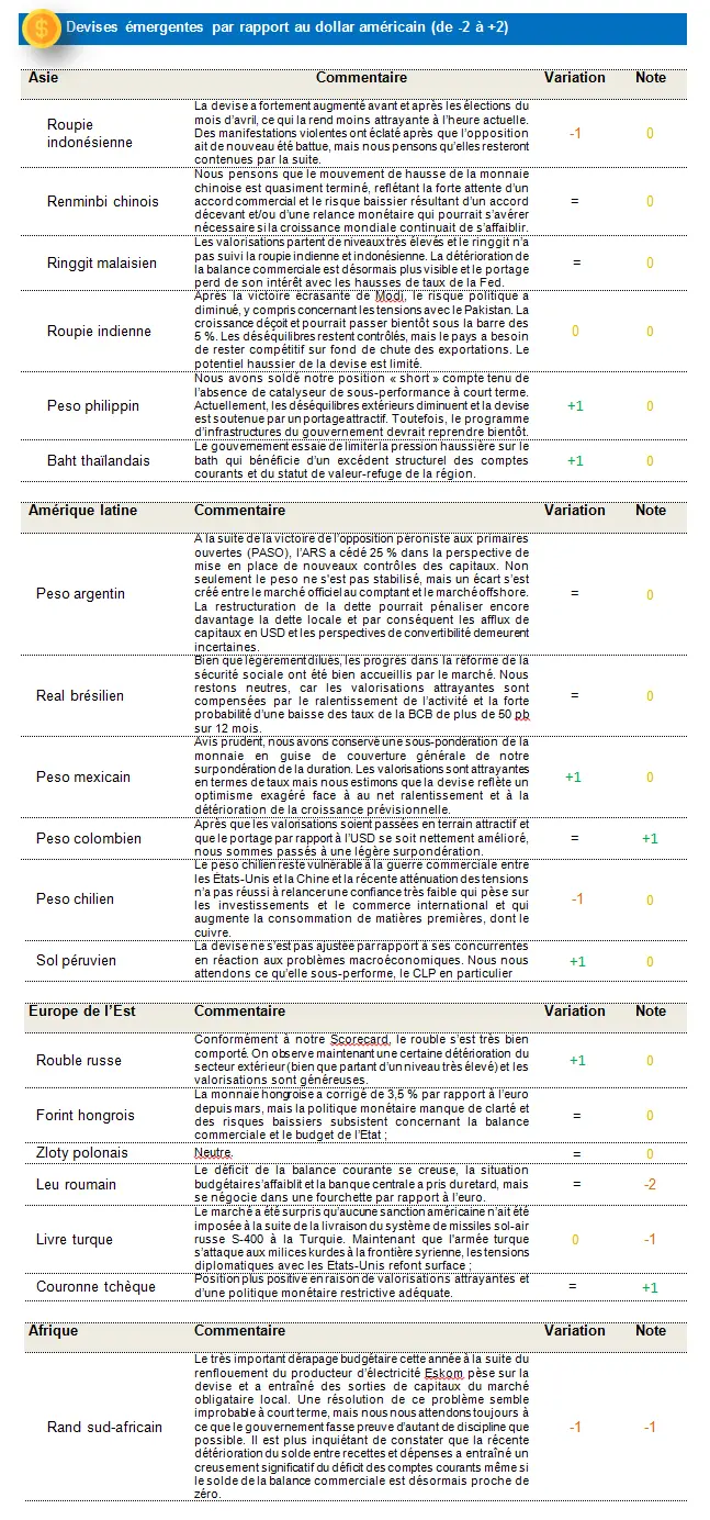 Notre scénario de base pour l’année 2019 table sur une croissance encore faible, mais en voie de stabilisation et en territoire positif en 2020, ce qui favorise la duration au détriment des taux de change et sur le plan des devises, les pays qui tirent profit du ralentissement afin de comprimer la demande intérieure et d’améliorer les soldes de leur balance extérieure.