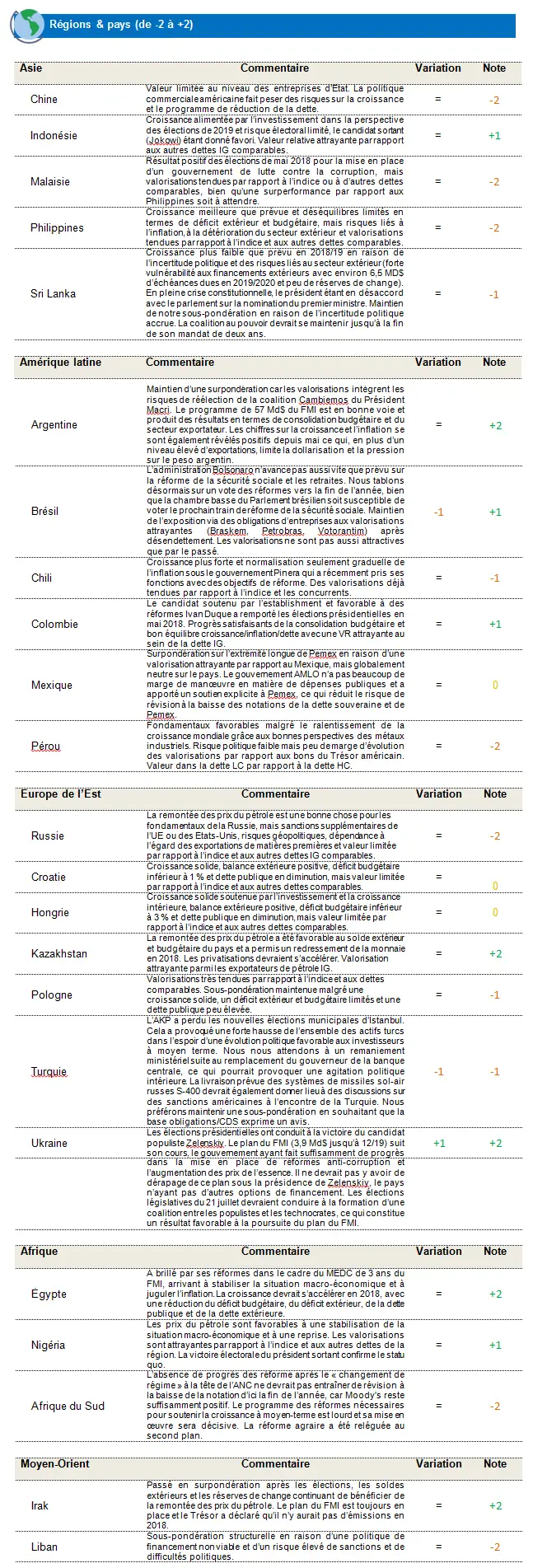 Dans l’univers HY, nous restons exposés à des situations idiosyncrasiques comme l’Égypte, le Ghana et l’Ukraine, qui continuent d’offrir de la valeur par rapport à l’équilibre des risques, ainsi qu’à des exportateurs d’énergie qui se négocient à des prix intéressants, comme l’Angola, Bahreïn et l’Équateur. Nous conservons une exposition envers l’Argentine, dont les obligations ont déjà baissé de plus de 45 % sur le mois et se négocient à des niveaux inférieurs aux valeurs de recouvrement estimées d’env. 60 à 70 centimes pour un dollar. Dans l’univers IG, nous détenons maintenant d’importantes positions sur le Qatar, la Colombie, l’Indonésie, le Panama et la Roumanie mais restons sous-exposés aux segments les plus chers de cet univers (Chine, Malaisie, Philippines et Pérou).