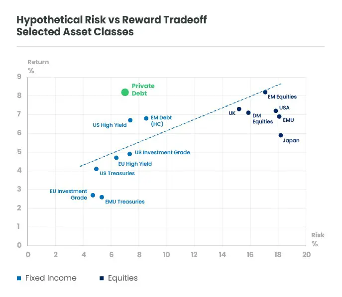 Le risque est la volatilité historique sur 5 ans. Les rendements des classes d'actifs cotées en bourse sont des projections sur 10 ans tirées de Candriam. La projection de rendement pour la dette privée est de 2,2 % plus 6 % pour l'€STR actuel ; les taux d'intérêt typiques sont de 6 à 7 % au-dessus de l'Euribor ou de l'€STR.