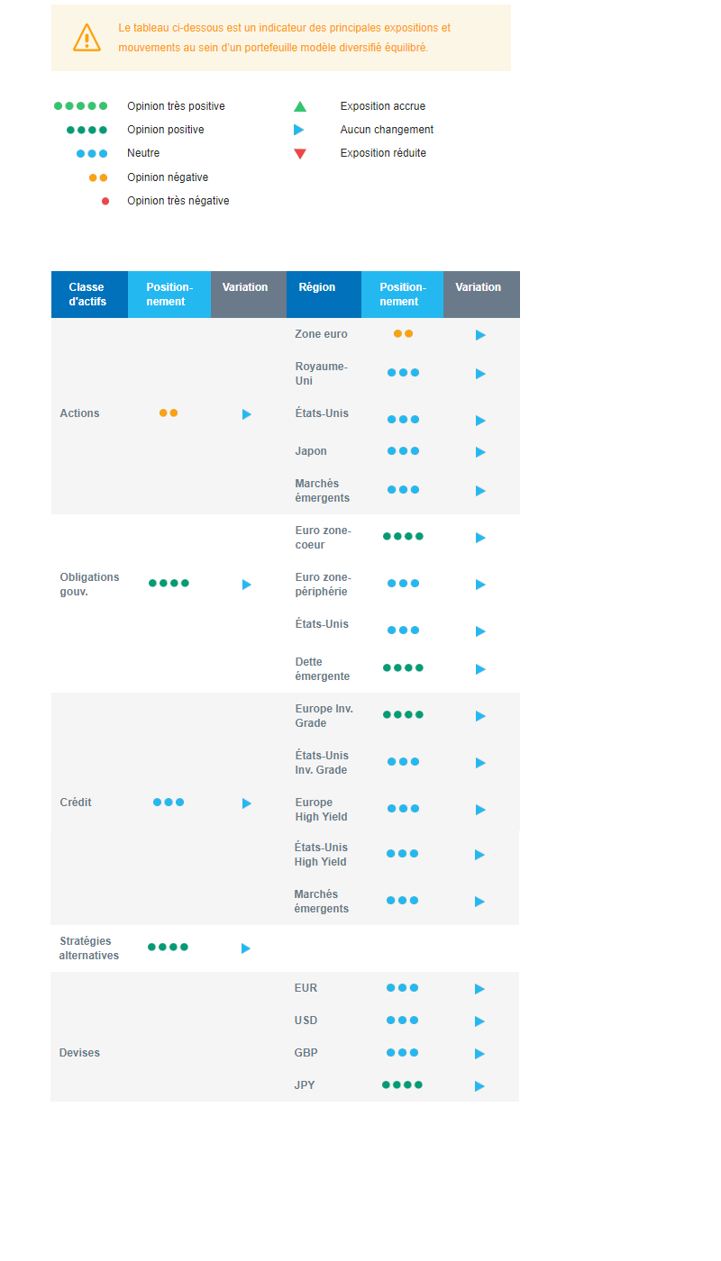 - Notre allocation d’actifs affiche une relative préférence pour les obligations par rapport aux actions, la prime de risque des actions étant actuellement insuffisante pour inciter les investisseurs à renforcer leurs positions.