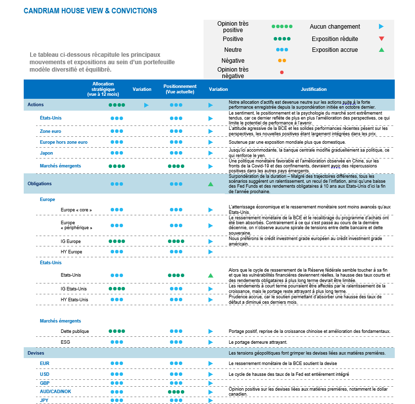 En ce qui concerne notre allocation multi-actifs, nous conservons une opinion neutre à l’égard des actions au vu des risques positifs et négatifs.