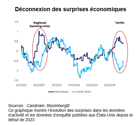 - Du « bruit » dans les données macroéconomiques : il est difficile d’évaluer la trajectoire sous-jacente de l’activité, de l’inflation et des politiques. Il n’y a pas eu d’atterrissage brutal, mais la croissance économique ralentit. Pour l'instant, certaines données émanant des enquêtes montrent des signes évidents de faiblesse, mais les données d’activité restent relativement stables. Cette déconnexion est un phénomène rare mais bien connu, qui se produit lorsque des chocs importants érodent la confiance des entreprises et des consommateurs, tandis que la production et les chaînes d'approvisionnement restent intactes à court terme. À terme, les deux devront converger.